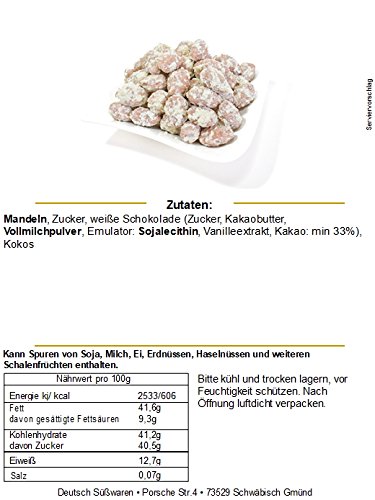 Specification: Gesuikerde Amandelen | Gebrande Amandelen met kokosnoot – witte chocolade | 500g
