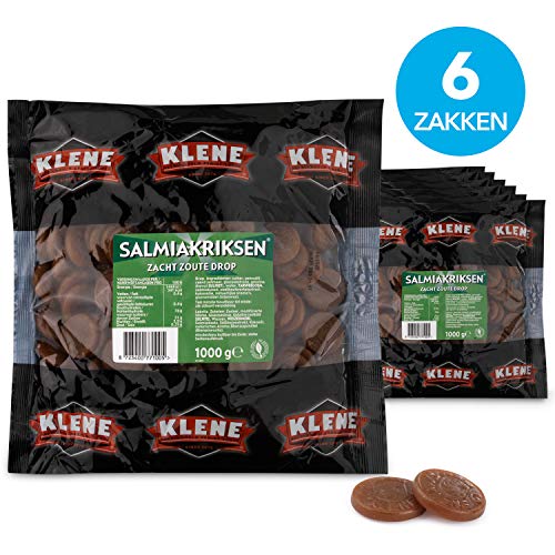 Specification: Klene Salmiakriksen, zoute drop met salmiak smaak – 6 zakken, inhoud van 1 kg, zachte drop in muntvorm